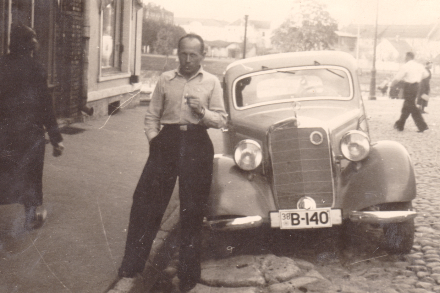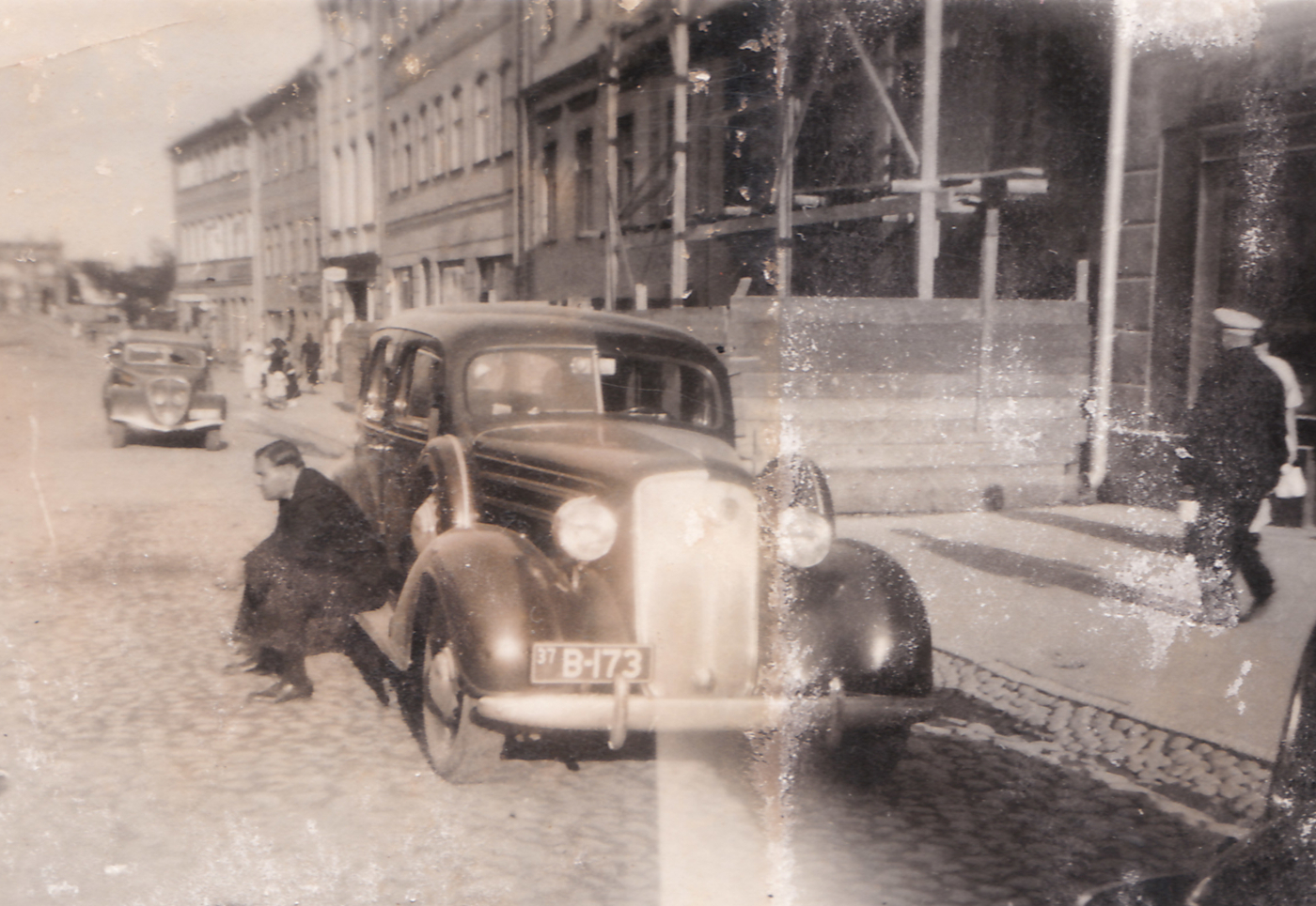 Johannes Paas 1937. a-l oma CHEVROLET' (B-173) astmelaual Tartus Raekoja platsil. Foto: Johannes Paasi album Valeri Kirsi kogust. |