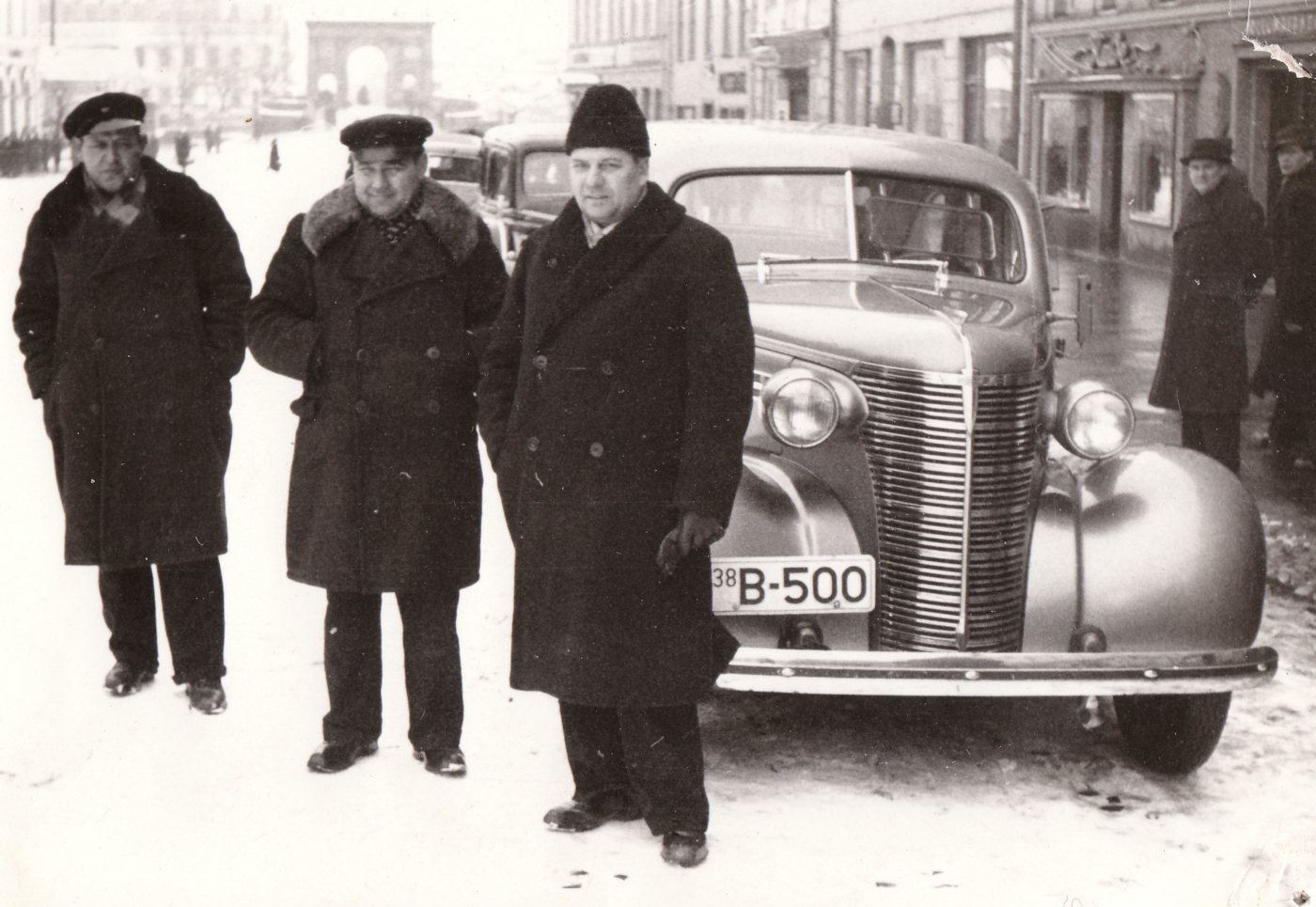 CHEVROLET (B-500) Tartus Raekoja platsil 1938/39. Keskel Johannes Paas. Foto: Johannes Paasi album Valeri Kirsi kogust. |