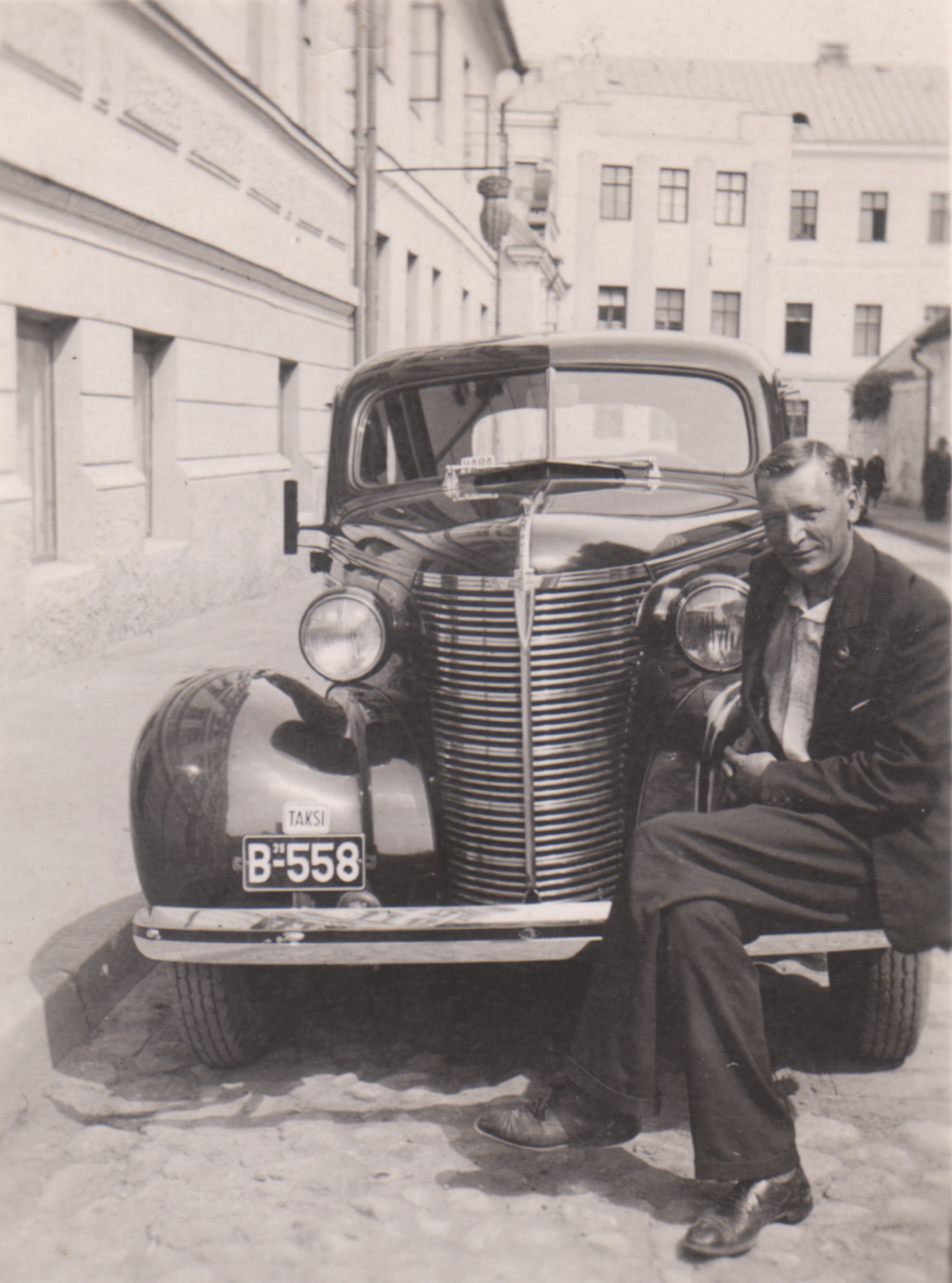 Johannes Paas ja tema uus takso CHEVROLET (B-500) Tartus Raekoja platsil 1938. aastal. Foto: Johannes Paasi album Valeri Kirsi kogust. |