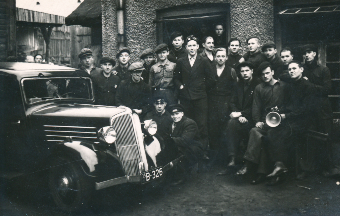 J. Lauritsa Pärnu autokooli Briti FORD V8 ning Pärnu autojuhtide ja motoristide kursustelt osavõtjad. Foto: Jüri Vaikjärve kogust. |