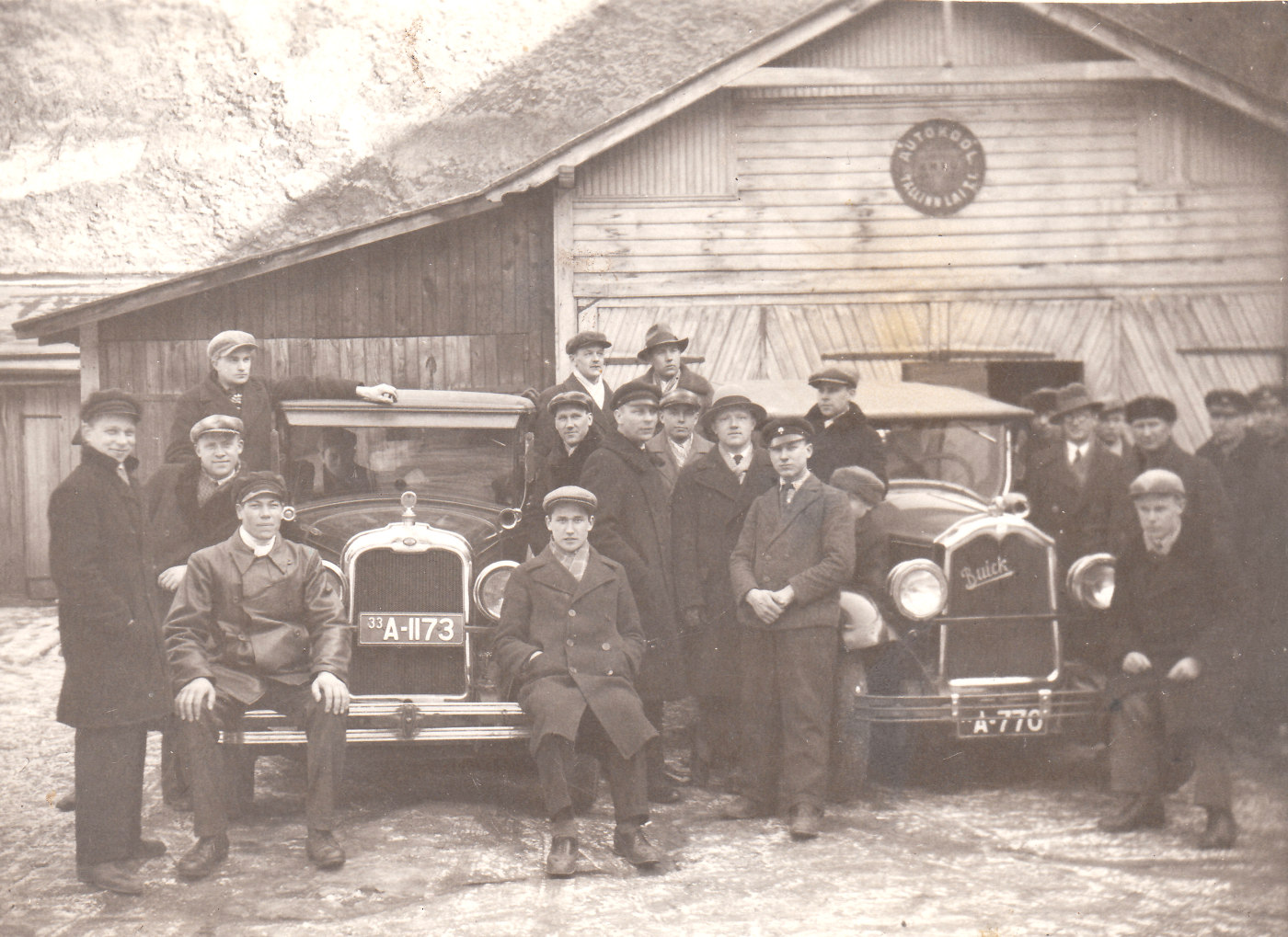 NMKÜ autokooli OAKLAND (A-1173) ja BUICK (A-770) 13. märtsil 1934 Tallinnas, ilmselt Lai 1 hoovis. Foto: Indrek Sirgi kogust. |