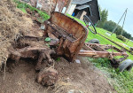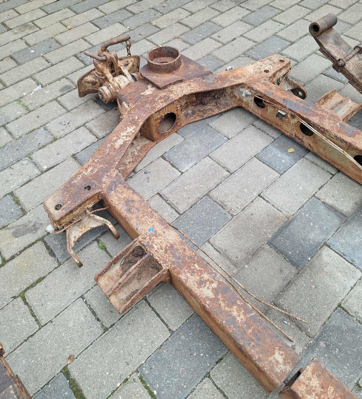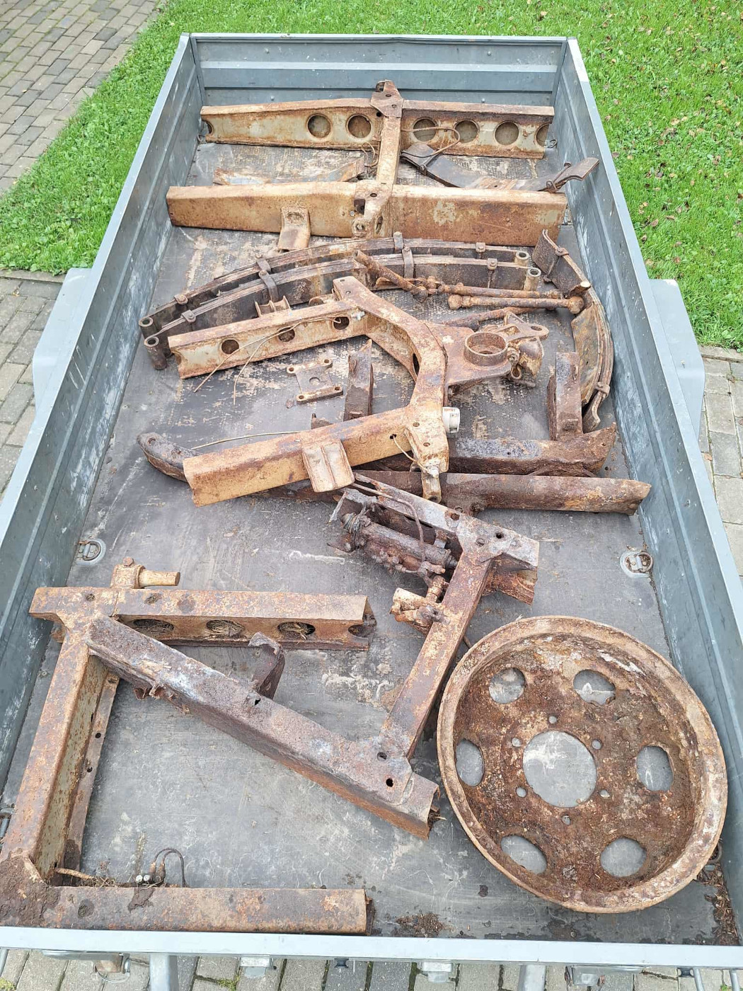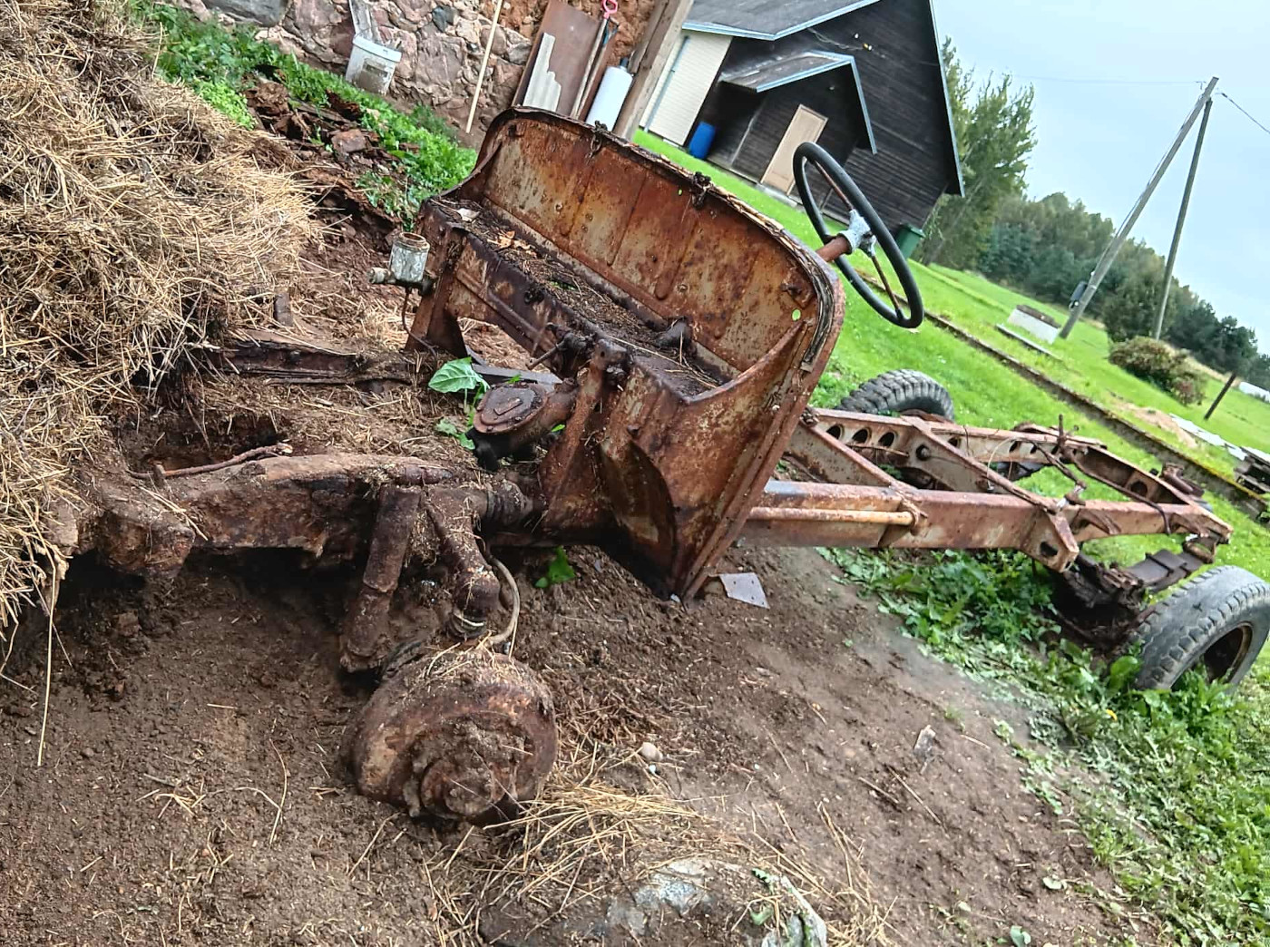 Võrumaalt. Alles on radiaatorivõre, radiaator, kaks ust, arvatavasti samale autole kuulunud pooltelg.